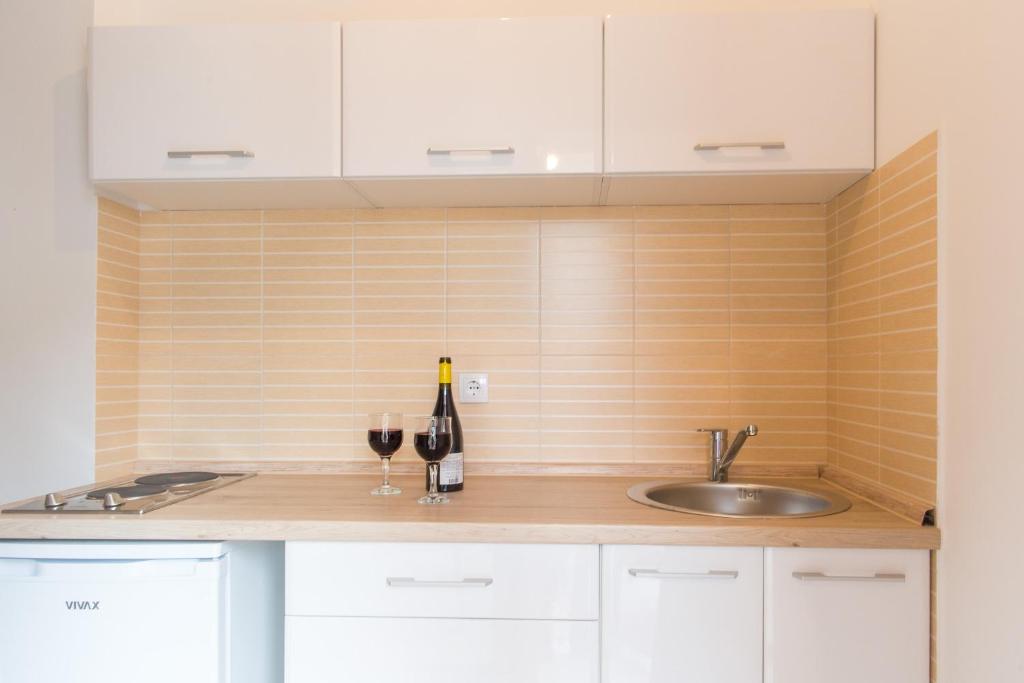 Kitchenette, Kitchen, Electric kettle, Stovetop, Wine glasses