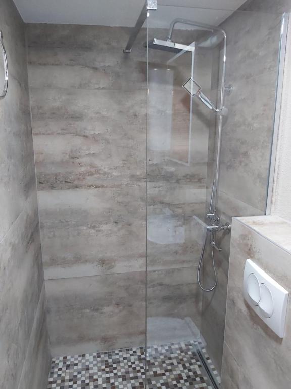 Shower, Bathtub or shower, Towels, Toilet paper, Walk-in shower, Body soap